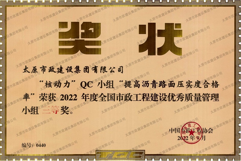 2022年度全國市政工程建設優秀質量管理小組三等獎_''核動力QC小組”提高瀝青路面壓實度合格率”